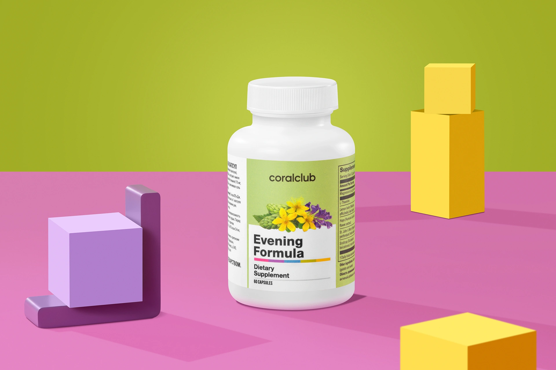 Теанин, экстракт листьев мелиссы, экстракт цветков хмеля, экстракт травы зверобоя, магний, экстракт корня шлемника, вспомогательные компоненты.